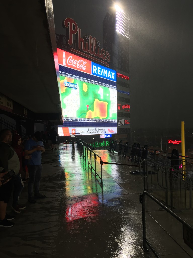 I’ve been to at least 10 different stadiums in cities from Anaheim and Colorado to Cleveland and D.C., but never have I seen a jumbo screen in the outfield engulfed by a weather radar map showing lots of red, yellow and green as rain pounded down.