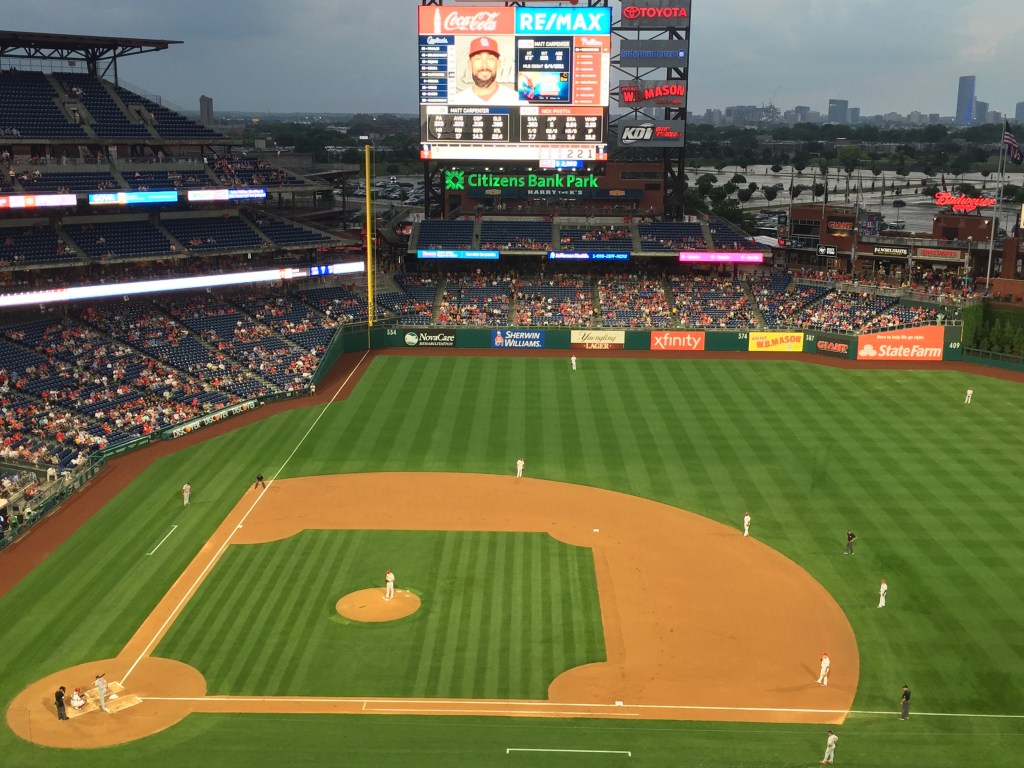 Within half an hour or so, the pond was gone, players were on the field and we were watching baseball. The Phillies went on to beat the St. Louis Cardinals that night, 4-3. As Red Sox fans, we didn’t really care who won and left around the 7th inning. We were a little tired and knew we were back on the road again in the morning for the first gig in D.C., so we figured we’d call it a night. But we saw a lot more baseball than we thought we would and were happy we went!