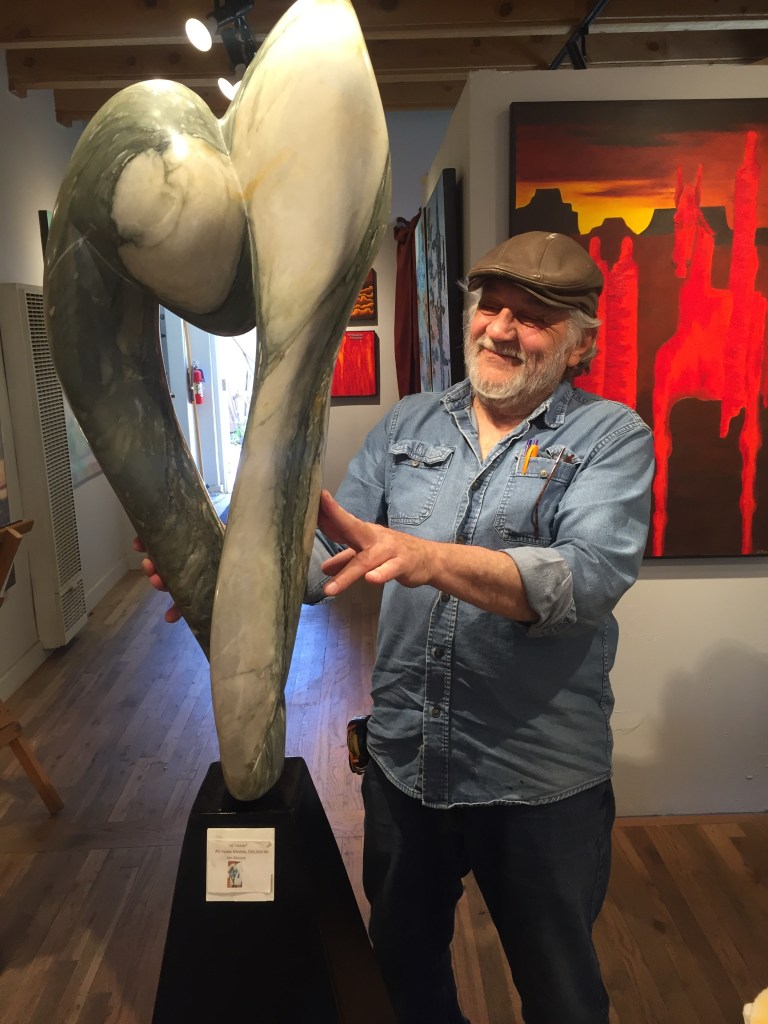 Inside were more rock sculptures, including a deformed, shiny grayish green heart on a pedestal he proudly spun. On the walls were elaborate abstract paintings by his wife, Jo.