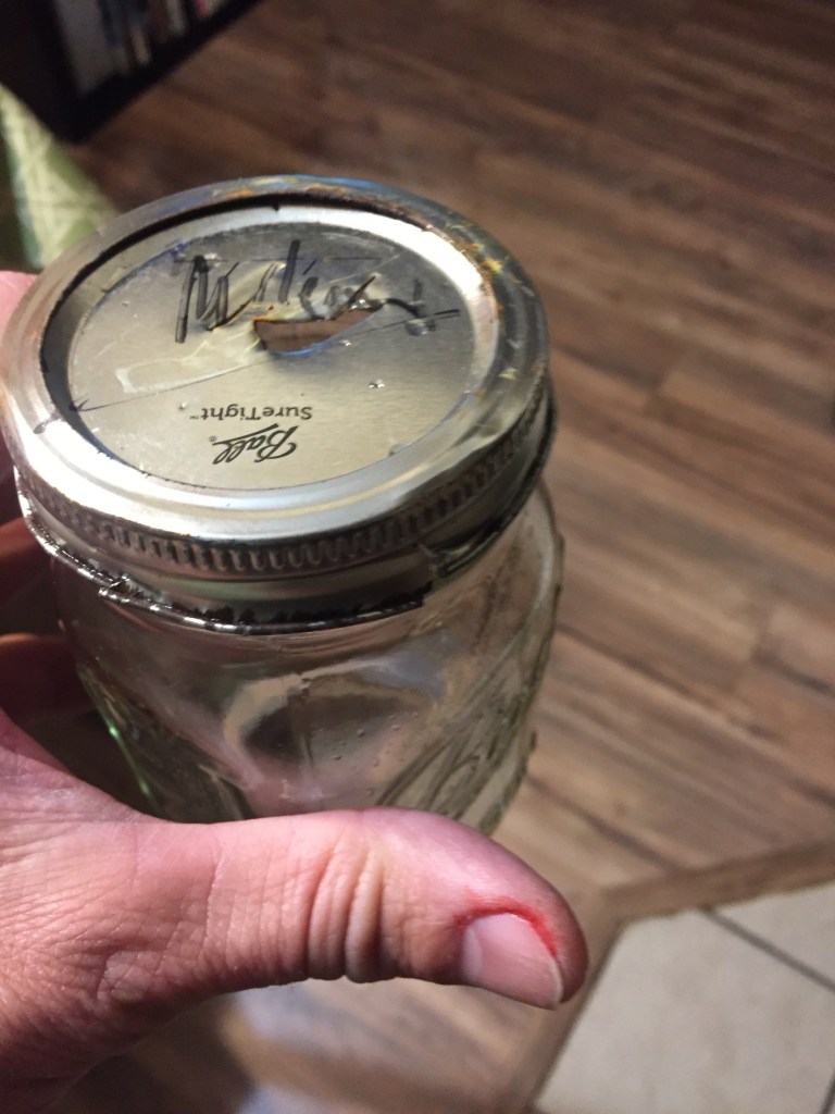 But probably from being in water that was formerly ice, the lid had rusted shut and I tried everything to get it open, from banging on the sides with a knife to prying from underneath. Nothing worked and I actually cut open my thumb in the process.