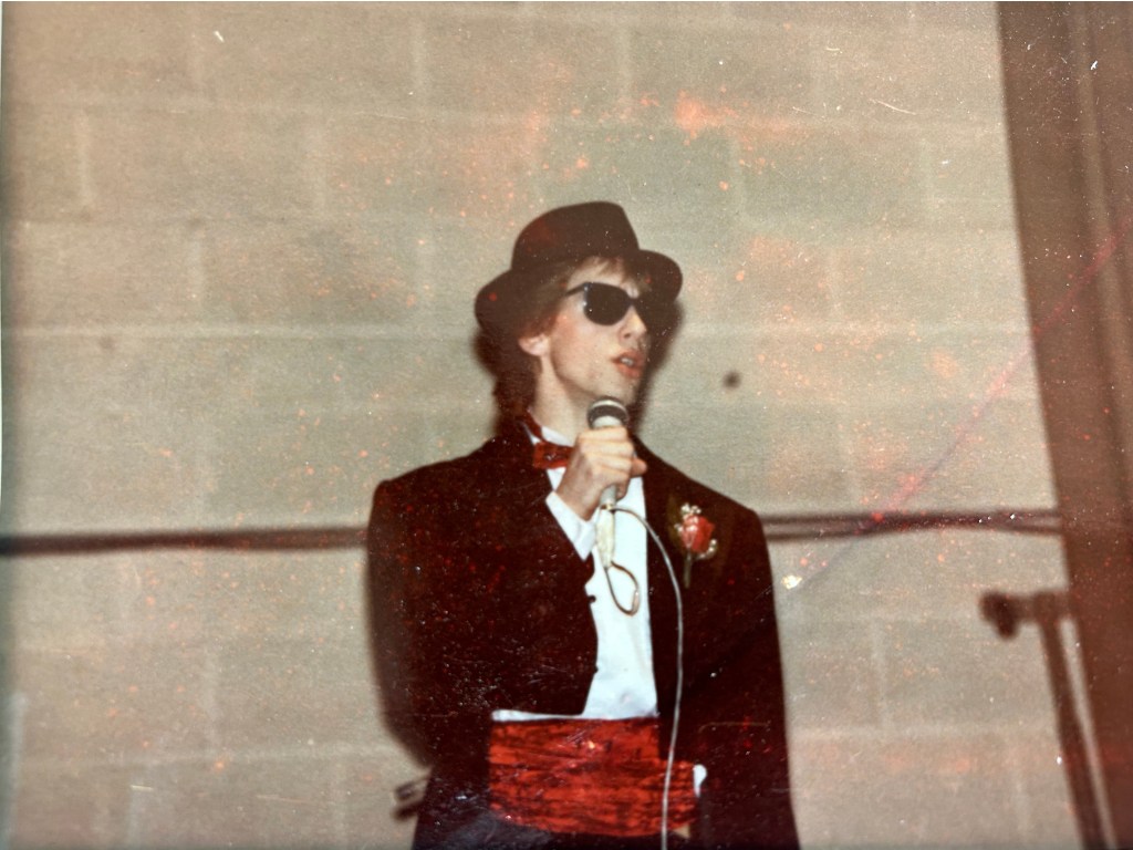 I wore a tux with a bad fedora hat – but I beat out the real musicians in the school and it was good for a smooth $35 pay day!